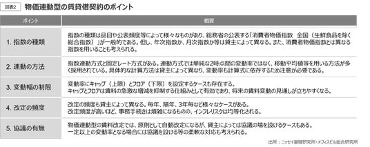 この契約形式の最も重要なポイントは「賃料をどのように物価に連動させるか」であり、その方法は貸主によって大きく異なる。また、「将来の賃料がいくらになるのか」という見通しが立ちにくいことも特徴だ。そのため、1.物価が急激に上昇、2.物価が下落、3.物価が安定的に推移した場合等、いくつかのシナリオを作成し、リスク負担を検討することが重要である。