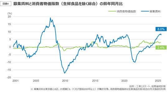 日本における物価(CPI)連動型の賃貸借契約は、契約期間が10~15年と長期に及ぶことが多い物流施設で先行して導入されてきたが、オフィスにおいても導入を進めるケースが増えている。ジャパンリアルエステイト投資法人が先行して2024年にオフィスでの導入実績を公表した。2025年には三井不動産、三菱地所が決算資料において物価連動型の賃貸借契約の導入を明記しており、野村不動産も導入実績を公表している。