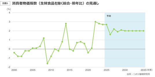ニッセイ基礎研究所の中期経済見通し(2025~2035年度)によれば、消費者物価上昇率(生鮮食品を除く総合)は将来的には2%前後で定着すると予測する。企業の人手不足感が強い状態が継続し、ベースアップで2%台の賃上げが続くことから、人件費の増加を価格転嫁する動きが広がることで物価も安定的に推移すると予想している。