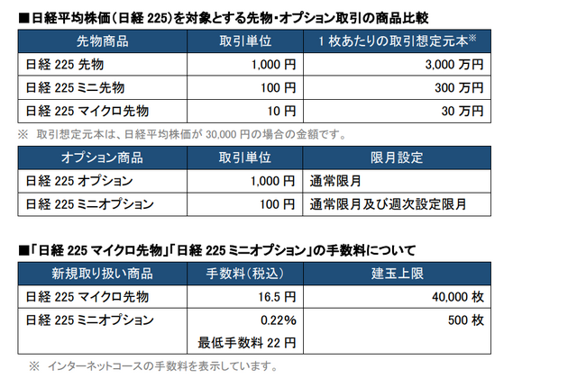 「日経225マイクロ先物」は、日経平均株価(日経225)を取引対象とする指数先物取引で、取引単位は日経225ミニ先物の10分の1である10円となり、「日経225ミニオプション」は、日経225オプションの取引単位を10分の1に変更したものとなりますので、お客さまは従来よりも少ない想定元本でお取引いただくことが可能です。