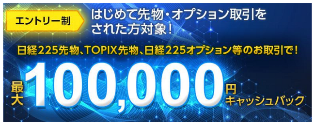 先物・オプションデビュープログラムにエントリーをして、エントリー月の翌月最終営業日までにお取引いただいたお客さまを対象に、最大100,000円キャッシュバックされる「先物・オプションデビュープログラム」をご用意しておりますので、ぜひご活用ください。