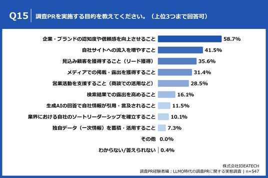 「Q15. 調査PRを実施する目的を教えてください。(上位3つまで回答可)」(n=547)と質問したところ、「企業・ブランドの認知度や信頼感を向上させること」が58.7%、「自社サイトへの流入を増やすこと」が41.5%、「見込み顧客を獲得すること(リード獲得)」が35.6%という回答となりました。