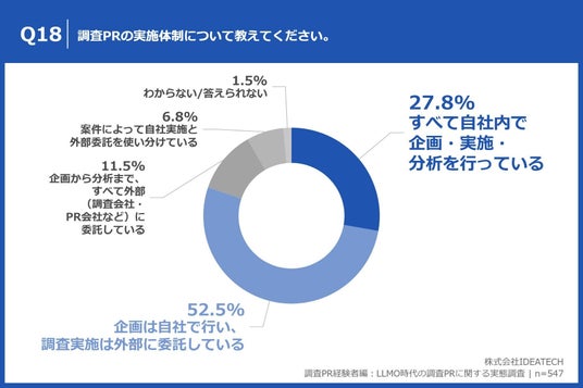 「Q18. 調査PRの実施体制について教えてください。」(n=547)と質問したところ、「すべて自社内で企画・実施・分析を行っている」が27.8%、「企画は自社で行い、調査実施は外部に委託している」が52.5%という回答となりました。