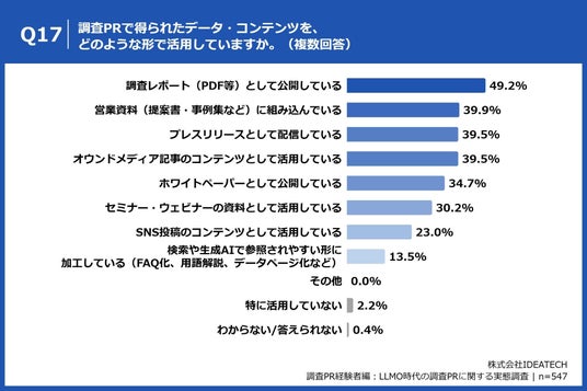 「Q17. 調査PRで得られたデータ・コンテンツを、どのような形で活用していますか。(複数回答)」(n=547)と質問したところ、「調査レポート(PDF等)として公開している」が49.2%、「営業資料(提案書・事例集など)に組み込んでいる」が39.9%、「プレスリリースとして配信している」が39.5%という回答となりました。