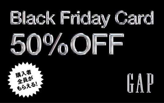 ブラックフライデー期間中 Gapでご購入されたお客様全員に、毎回のお買い物が50%OFFになる「Black Friday Card」を提供します。今年はストアだけではなく公式オンラインストアでのご購入者も対象。Black Friday Cardは2024年12月3日(火)~12月25日(水)の期間中に使用いただけます。
