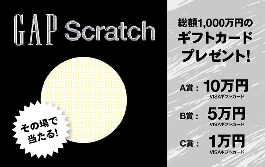 さらに、全国のGapストアで税込み5,000円以上ご購入ごとにスクラッチカードを1枚プレゼント。総額1000万プレゼントキャンペーンのスクラッチ抽選会に参加でき、スクラッチカードを削ってその場で当たりがでると10万円、5万円、1万円のVISAギフトカードを贈呈いたします。