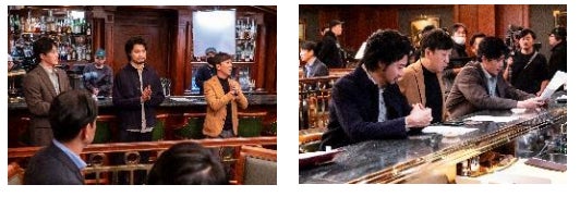 今回の撮影は、雰囲気のあるレトロなバーを舞台に「秘密(使う)篇」の撮影からスタートしました。大人らしい渋めのジャケットで現れた小栗さん、青木さん、飯塚さん。バーの席を埋めつくすエキストラと豪華な撮影スタジオには、青木さんが「これって打ち上げですか?」と突っ込むほど。最年長の飯塚さんが「かっこつけさせてよ!」とVポイントで奢るシーンも、スマートに演じられていました。