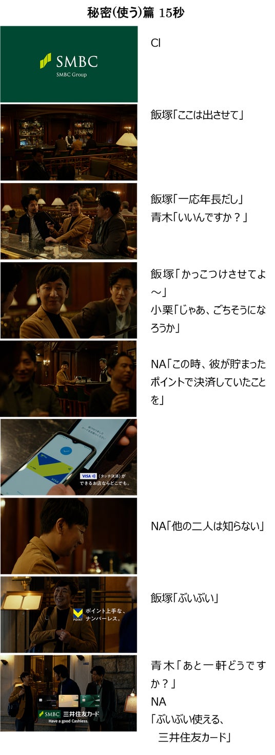 「お支払いは誰がする?」といった、よくある飲食店での会話を起点に、ナンバーレスカードを用いてスマートにVポイントを貯めては使う、大人の男たちがそっと見せるお支払いの"秘密"を描いたCMです。