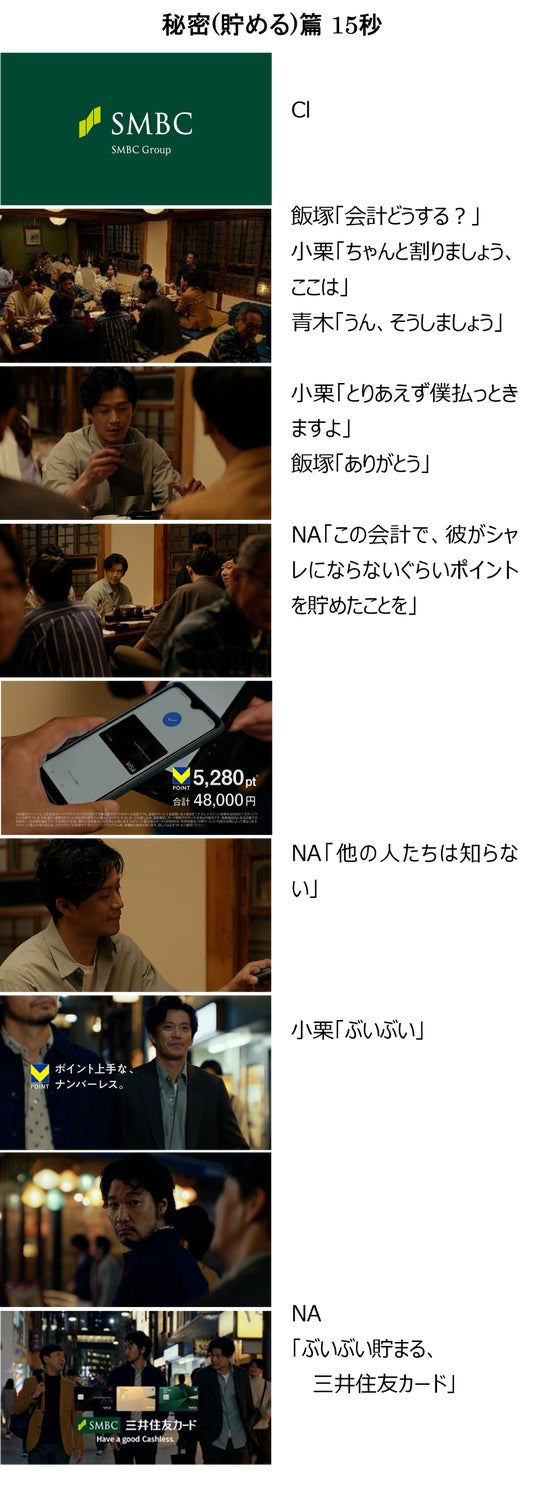三井住友カード株式会社(本社:東京都江東区、代表取締役社長:大西 幸彦、以下「三井住友カード」)は、ナンバーレス仕様のクレジットカード「三井住友カード(NL)」の新TV-CMとして、小栗旬さん、青木崇高さん、東京03の飯塚悟志さんが出演する「秘密(貯める)」篇 /「秘密(使う)」篇を2025年2月13日(木)より全国でオンエア開始いたします。