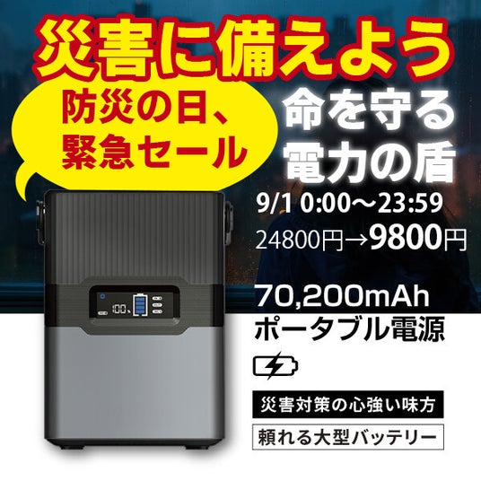 楽天「Show !t」では、防災の日である9月1日0:00~23:59に、緊急時や災害時に役立つポータブル電源を数量限定で60%オフ、15,000円引きで販売いたします。電動キックボードの充電にも最適ですので、この機会をお見逃しなく。
