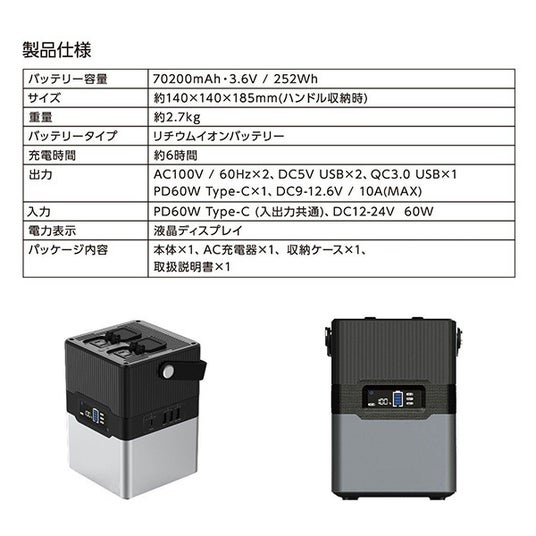 バッテリー容量70200mAh、252Wh ポータブル電源