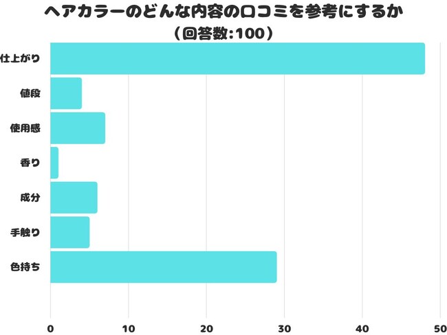 ヘアカラーのどんな内容の口コミを参考にするかをアンケートにて調査したところ、1位は「仕上がり」でした。