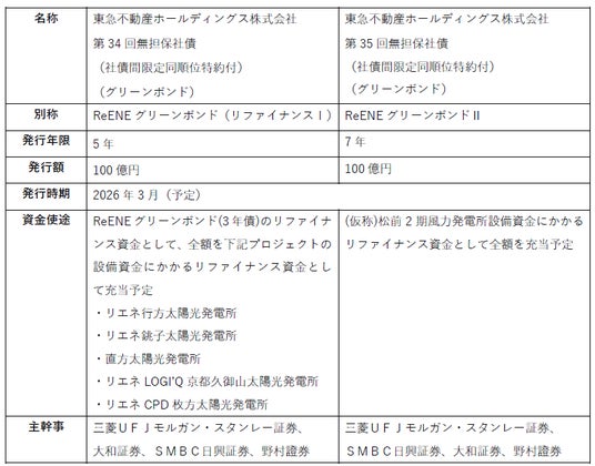 東急不動産ホールディングス株式会社(本社:東京都渋谷区、代表取締役社長:西川 弘典、以下「当社」)は、公募形式のグリーンボンド「ReENEグリーンボンド(リファイナンスI)」及び「ReENEグリーンボンドII」の発行(以下「本発行」)を予定しておりますのでお知らせいたします。