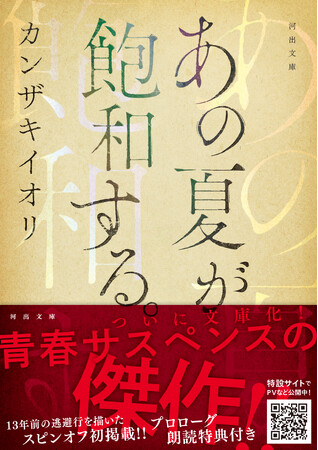 株式会社河出書房新社(本社:東京都新宿区/代表取締役:小野寺優)は、大ヒットを記録したカンザキイオリさんの小説デビュー作『あの夏が飽和する。』の文庫版(税込価格858円)を2024年6月27日に刊行いたします。また文庫化を記念して、河出書房新社、Amazonオーディブル(以下、Audible)、そしてメディアドゥと協力し、オーディオブックを制作いたしました。人気声優3名と著者自らが熱演した朗読を、単行本『あの夏が飽和する。―全文朗読付き完全版―』 (税込価格6,380円)、Audible版『あの夏が飽和する。』(Audible会員プラン聴き放題対象作品/単品購入価格3,800円)として、文庫と同時に発売します。