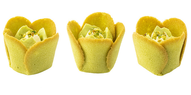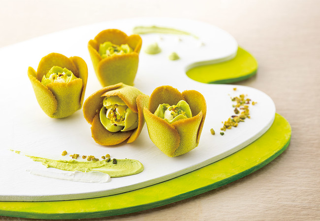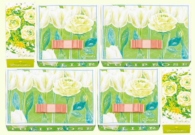 代表作「チューリップローズ」の最新作は“ピスタチオの花園”。外は美しい「グリーン・チューリップラングドシャ」。中には、ピスタチオ&ミルクのホイップショコラを咲かせました。ナッティなピスタチオの魅力を、クリーミーなミルクのコクとともに味わう『チューリップローズ ピスタチオ』です。