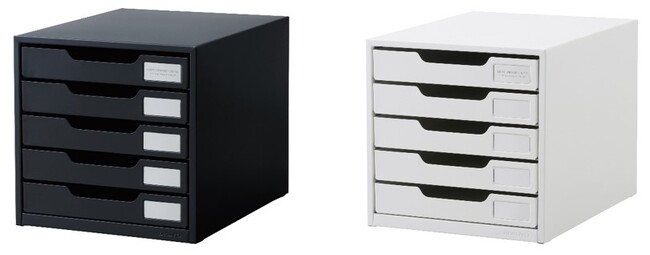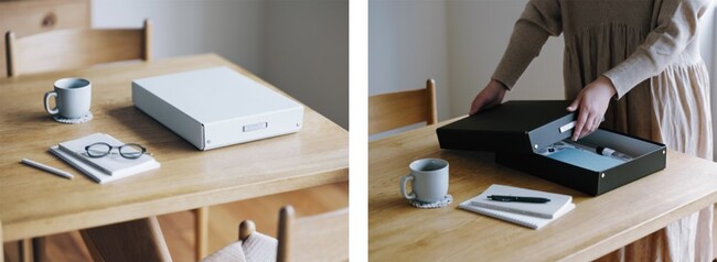 今回発売するのは、書類をトレーごとに分けて収容が可能な引き出しタイプのスチール製のレターケース3段タイプと5段タイプ。書類や封筒に加えて、文具やかさばる小物をまとめて収容できるフタ付きデスクトレー。日用品の予備などを入れられる段ボール製のストックボックスの3アイテム8品番です。オフィスで書類や備品整理に使われてきた使い心地の良さはそのままに、くらしの空間や、趣味部屋の空気感にもなじむようにリデザインしています。スタイリッシュなブラックとやわらかなホワイトの2色のラインアップで、洗練された雰囲気に生まれ変わりました。