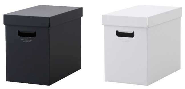 積み重ねもできるフタ付きの収納ボックスです。持ち運びに便利な取っ手穴付きで、軽い段ボール製なので積み重ねて整理できます。また、A4ファイルが横に入る深さがあり、不定形のものを収容するのにも便利です。フタ付きなので、書類や衣類などの収容品からホコリを防ぎ、くらしの空間をすっきりさせることができます。