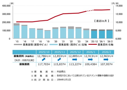 募集賃料は前月比プラス50円/坪の12,963円/坪となり、6ヵ月連続で上昇している。緩やかな上昇傾向が継続し、賃料は13,000円/坪台目前で推移している。