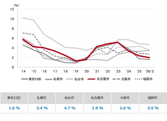 三幸エステート株式会社(本社:東京都中央区、取締役社長:福島正二郎)は、2026年2月度の名古屋市オフィス賃貸状況(空室率&現空面積:全規模、募集賃料&募集面積:全規模、規模別空室率、主要エリア※1空室率:全規模)および全国6大都市(東京・札幌・仙台・名古屋・大阪・福岡)の大規模ビルのマーケットデータをまとめた「オフィスマーケット2026年3月号名古屋」を公表します。