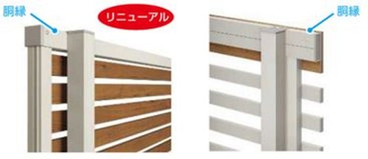 「ルシアス フェンス」9デザイン、「シンプレオ フェンス」17デザインをリニューアルし、各フェンス新たに1デザインを追加。全デザイン共通で上下胴縁がフラット化し、横基調のデザインはスリムなたて枠、中骨の背面配置により、横格子の連続感を高める連結が可能です。
