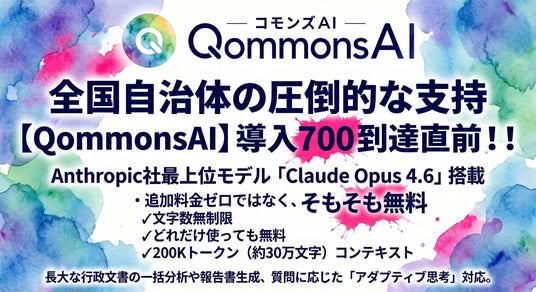 自治体行政のAXを推進するPolimill株式会社(本社:東京都港区/代表取締役:伊藤あやめ・谷口野乃花)は、行政向け生成AI「QommonsAI(コモンズAI)」に、Anthropic社の最上位モデル「Claude Opus 4.6」を標準搭載したことをお知らせします。Claude Opus 4.6は200Kトークンのコンテキストウィンドウと最大128Kトークンの出力に対応し、長文の一括分析と“崩れない”長尺生成を大幅に強化します。