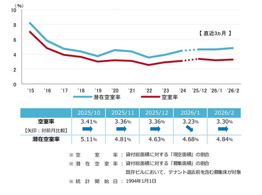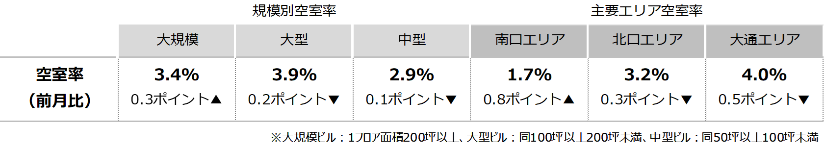 空室率は前月比プラス0.07ポイントの3.30%となり、前月から小幅に上昇した。新築ビルがまとまった面積の空室を抱えて竣工し、主な上昇要因となっている。エリア別では「南口」が前月比プラス0.8ポイントの大幅な上昇となった。潜在空室率は前月比プラス0.16ポイントの4.84%だった。
