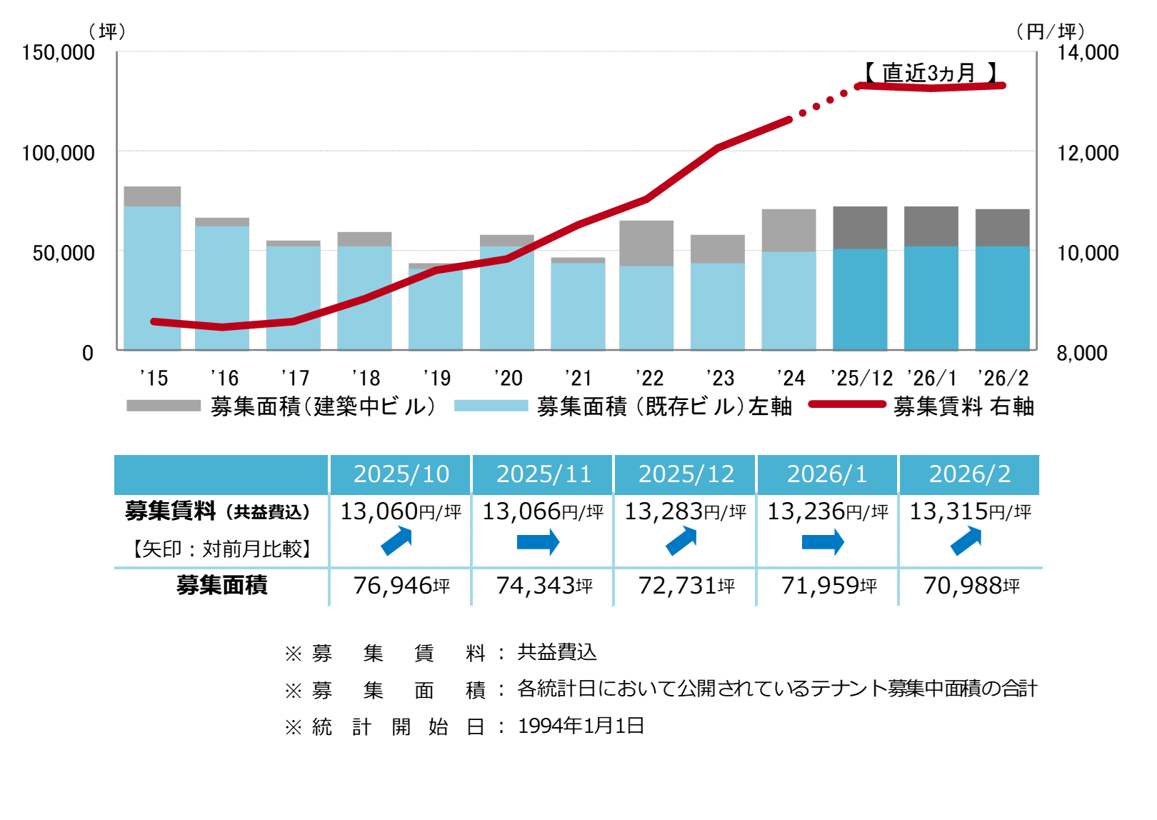 募集賃料は前月比プラス79円/坪の13,315円/坪となり、前月から上昇した。賃料は統計開始以来の最高値を更新している。