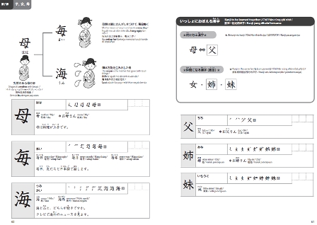 それぞれの漢字にイラストと意味の説明がついており、同じパーツを持つ漢字のつながりや相違点がすぐに分かります。漢字のイメージをふくらませ、楽しく覚えるのを助けます。翻訳には英語・ベトナム語・中国語・インドネシア語が付いています。