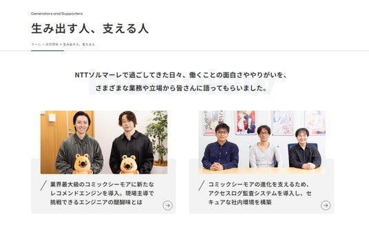 NTTソルマーレのビジョンや事業概要をより多くの方に知っていただくため、画像を多く活用したビジュアルデザインを採用し、事業紹介ページへの導線を強化しました。
