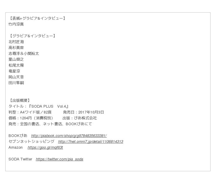 昨日10月3日、ぴあ株式会社より『SODA PLUS Vol.4』が発売となりました。次世代俳優U-25特集! 今、彼らは何を思い、何を語るのか…。撮り下ろし写真で、テキストで、彼らの今をたっぷりお届けします!