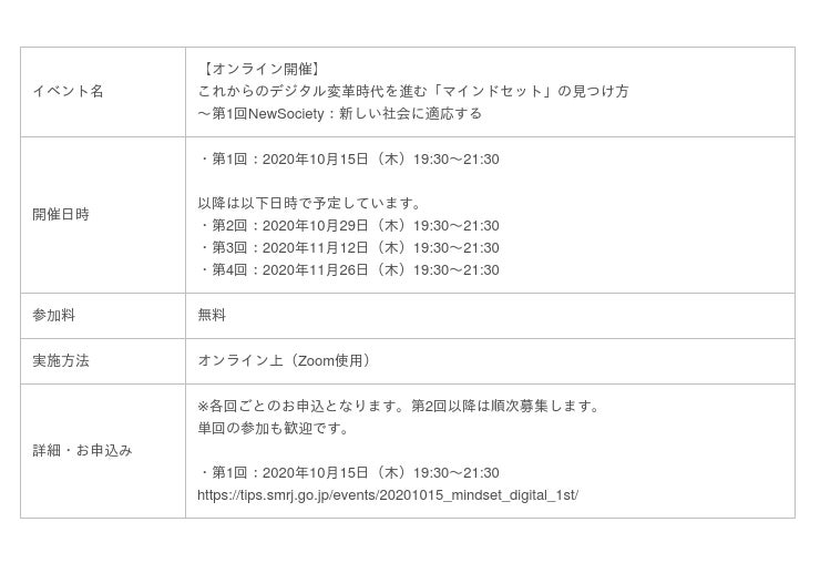 独立行政法人中小企業基盤整備機構(略称:中小機構、本部:東京都港区、理事長:豊永 厚志)創業・ベンチャー支援部 TIP*Sは、2020 年 10月15日から新しいアクションをしたい方へむけて、オンラインのワークショップ「これからのデジタル変革時代を進む「マインドセット」の見つけ方」(全4回・単回参加可能)を開催スタートします。