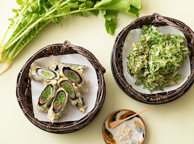 大根の若葉の葉と茎、味わいと食感を楽しむ2種類の天ぷらです。