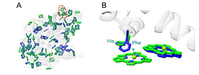 (A)グレオバクターPSI単量体のクロロフィル(青)と他のシアノバクテリアPSIクロロフィル(緑)との違いを示した。赤点線は特徴的なクロロフィル。(B)特徴的なクロロフィルの拡大図(Aの赤点線で囲んだ部分)。グレオバクターPSI(青)、他のシアノバクテリアPSI(緑)。他のシアノバクテリアPSIでは、ヒスチジン(His)と水分子(シアン)が水素結合し、さらにその水がクロロフィルに配位していた。一方、グレオバクターPSIでは、ヒスチジンではなくフェニルアラニン(Phe)であるため、水素結合が形成されず、クロロフィルをもつことができない。