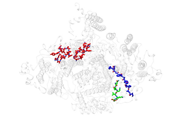 グレオバクターPSIの単量体に着目し、他の生物の構造とは異なるPsaA(赤)、PsaB(青)、PsaF(緑)の特徴的な構造を示した。