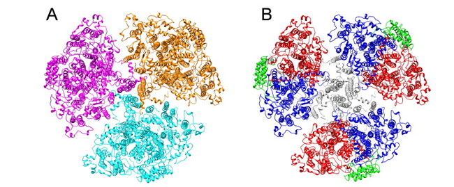 (A)グレオバクターPSI三量体の立体構造。マゼンタ、シアン、オレンジ、のそれぞれがPSI単量体。(B)PsaA(赤)、PsaB(青)、PsaF(緑)を表した。