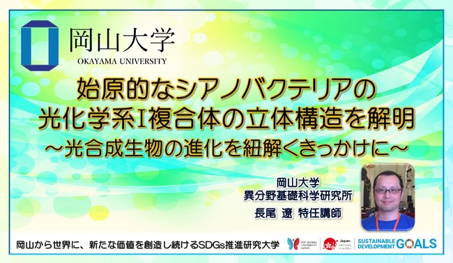 国立大学法人岡山大学(本部:岡山市北区、学長:槇野博史)異分野基礎科学研究所の長尾遼特任講師、加藤公児特任准教授、沈建仁教授と理化学研究所放射光科学研究センターの米倉功治グループディレクター(東北大学多元物質科学研究所教授)、浜口祐研究員(現客員研究員、東北大学多元物質科学研究所准教授)の研究グループは、神戸大学の秋本誠志准教授、村上明男准教授(現研究員)と理化学研究所環境資源科学研究センターの堂前直ユニットリーダーとの共同研究により、クライオ電子顕微鏡を用いて、始原的なシアノバクテリアであるグレオバクターのPSI三量体の立体構造解析に成功しました。