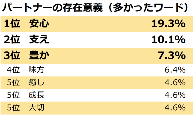 まずは、パートナーの存在意義はなんだと思うか聞いてみました。自由に記述してもらったところ、同じような言葉が多く出たため、ランキングにいたしました。「安心」という言葉が最も多く見られました。コロナ禍となり2年半以上が経過し、最近ではまた感染者数が増え始めています。先行きが見えないこの時代において「安心」はとても大切なことではないでしょうか。