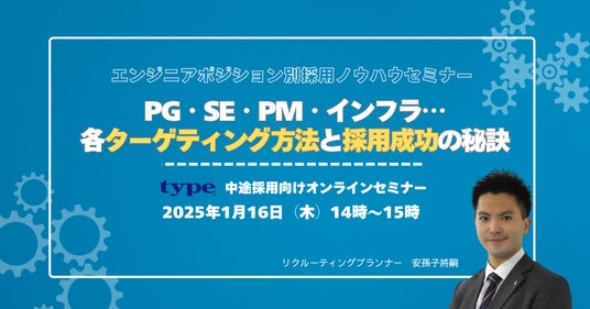 転職サイト「type」では、1/16(木)14時より、「【中途採用ご担当者様向けオンラインセミナー】エンジニアポジション別採用ノウハウセミナー ~PG・SE・PM・インフラ…各ターゲティング方法と採用成功の秘訣~」を開催いたします。