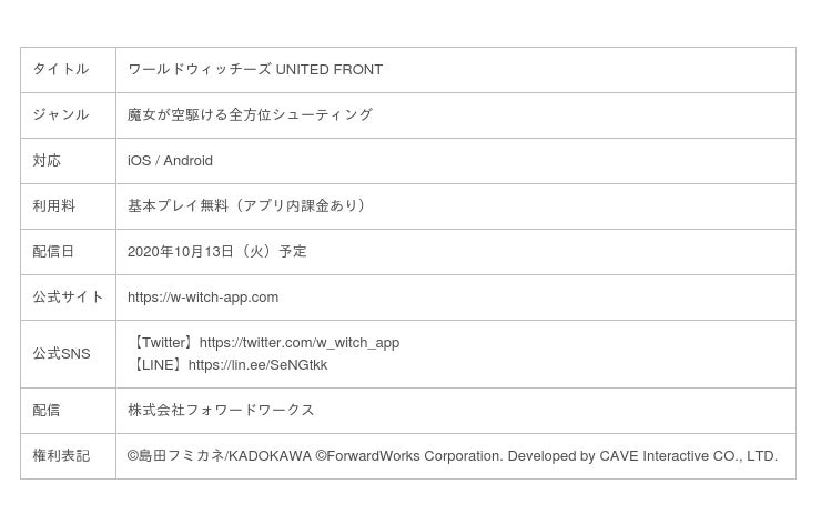 株式会社フォワードワークス(以下、FW)は、株式会社KADOKAWA(以下、KADOKAWA)と協業し、株式会社ケイブ(以下、ケイブ)と共同開発している新作スマートフォン向けゲームアプリ『ワールドウィッチーズ UNITED FRONT』のサービス開始日を2020年10月13日(火)に決定したことを発表いたしました。それに合わせて、AppStoreでの予約注文を開始しています。