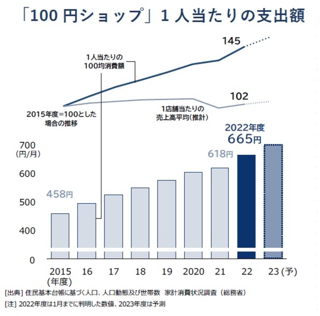 100円ショップの1人当たり購買額を推定すると、2022年度は平均で665円/月となり、増加幅は10年度以降最大となる47円だった。積極的な店舗展開や販売チャネルの多様化、アウトドア用品など日用雑貨以外の商品ラインアップが拡充されたことで顧客層が広がったこと、150~200円などミドル・ハイプライス商品の購入が増えていることなどが要因となった。
