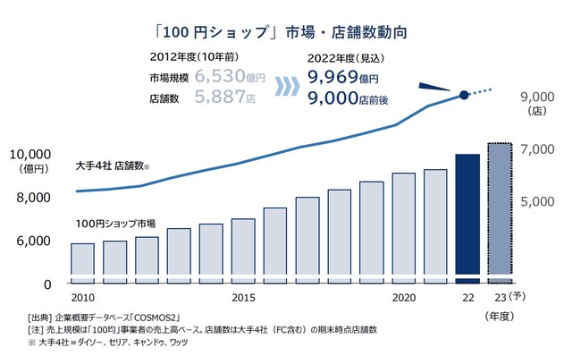 ワンコインで生活用品の多くが揃う「100円ショップ」市場の成長が続いている。大手4社を中心とした国内100円ショップ市場(事業者売上高ベース)は、2022年度は前年から7.2%(約671億円)増の約9969億円となる見込みで、1兆円にせまる規模となった。このペースで推移すると、100均市場は2023年度に1兆円の突破が確実とみられる。