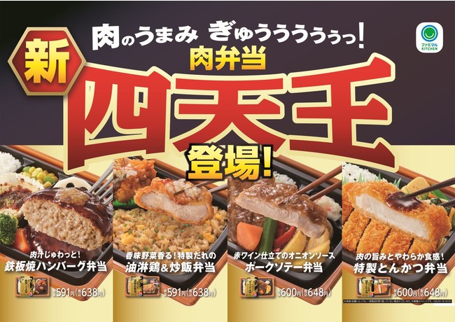 このたび、ソースのリニューアルや、新メニューを加え、「【新】肉弁当 四天王」として、「肉汁じゅわっと!鉄板焼ハンバーグ弁当」(税込638円)、「香味野菜香る!特製だれの油淋鶏&炒飯弁当」(税込638円)、「赤ワイン仕立てのオニオンソース ポークソテー弁当」(税込648円)、「肉の旨みとやわらか食感!特製とんかつ弁当」(税込648円)の4種類を発売いたします。