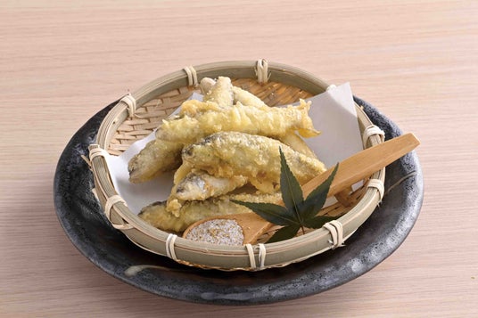 [岐阜県産]稚鮎の天ぷら~山椒塩添え~外はカラッと軽やかに、中はふっくら柔らかく揚げた稚鮎は、初夏にしか味わえない繊細で上品な逸品です。お酒との相性も抜群です。