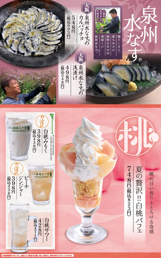 株式会社モンテローザ(本社:東京都杉並区 代表取締役:大神輝博)は、2025年6月1日(日)から「千年の宴」「福福屋」「月の宴」「竹取酒物語」で季節限定メニューの販売を開始しました。『稚鮎の天ぷら』や『薬味たっぷりそうめん』、『泉州水なす(R)』や、『白桃パフェ』など、夏の味覚を存分に味わえるメニューをご用意しました。
