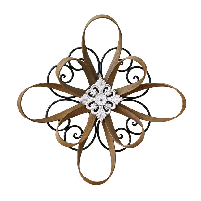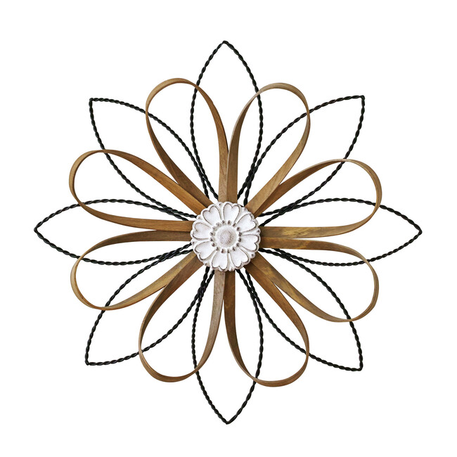 アイアンとベルト状のウッドとの異素材の組み合わせ。直線的なアイアンのラインとウッドのやわらかなカーブが重なり素敵な花模様の印象に。