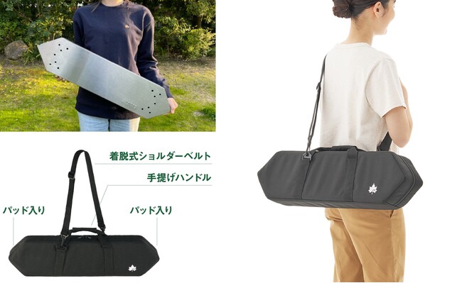 収納時はコンパクトで、専用の収納バッグも付属します。収納バッグは、傷や外部の衝撃からアイテムを守るパッドが入っているほか、荷物が多く両手が塞がった時にも持ち運べるよう、肩掛けできるベルトも付いていおり、持ち運びや保管に便利です。