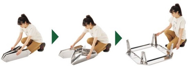 一瞬で開くワンアクション構造で、天板の連結や足の組み立ては一切不要。