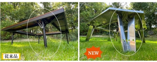 フラットな棒状を2本組み合わせたような形の足で四隅を支える構造になっており、ポール型の足で支える構造と比べると安定感抜群。各テーブルが独立していない一体型、かつ軽量なのでサイト内の移動もラクラク。