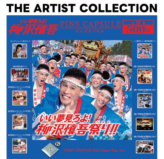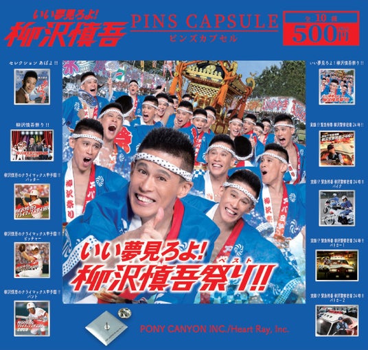 今回発売するカプセルトイは、『いい夢見ろよ!柳沢慎吾祭り!!』と題して、「柳沢慎吾」がリリースしてきたCDや映像作品を基にデザインしたピンバッジ(ピンズ)が専用台紙と共にカプセル内に収納されており、コレクションにも最適です。