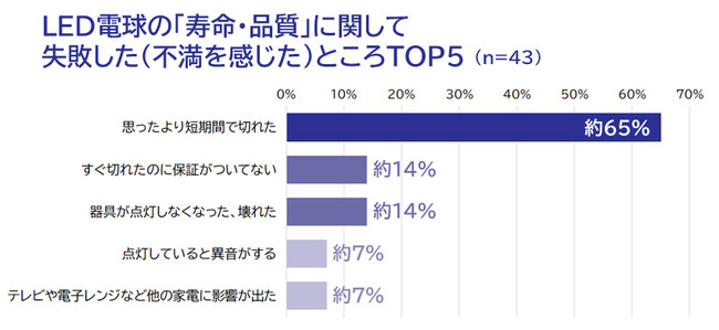 「寿命・品質」では「思ったより短期間で切れた」が約65%と圧倒的に多く、「すぐ切れたのに保証がついてない」「器具が点灯しなくなった、壊れた」が約14%、「点灯していると異音がする」「テレビや電子レンジなど他の家電に影響が出た」が約7%と品質面や選び方に課題がありそうです。